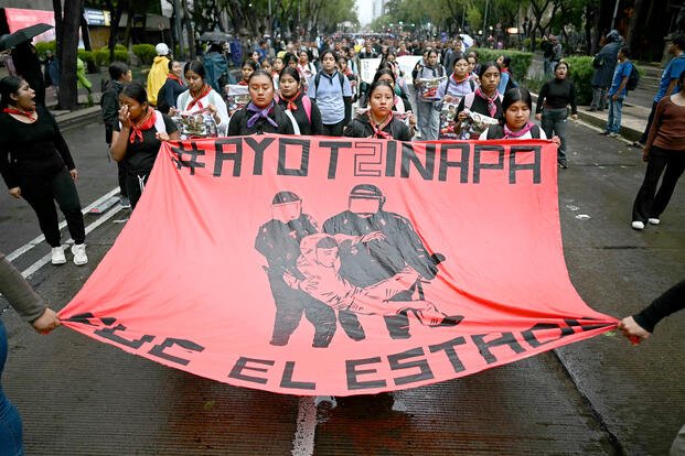Demonstrators take part in a protest over the 11th anniversary of the disappearance of 43 students from the southern town of Ayotzinapa in Mexico City on Sept. 26, 2025. In September 2014, 43 students from the Ayotzinapa Rural Normal School disappeared after being forcibly abducted in Iguala, Guerrero, Mexico, in what has been called one of Mexico's most infamous human rights cases. (Carl De Souza/AFP/Getty Images/TNS)