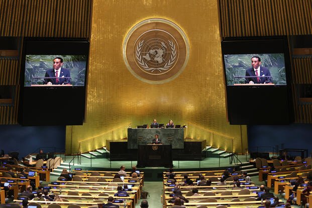 Transitional Prime Minister of Sudan Kamil El-Tayeb Idris addresses the 80th session of the United Nations General Assembly, Thursday, Sept. 25, 2025, at U.N. headquarters. (AP Photo/Pamela Smith)
