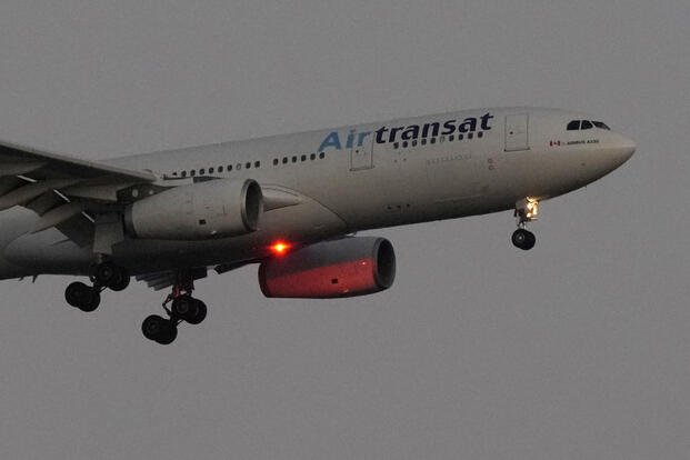 An Air Transat Airbus A330 approaches for landing in Lisbon just before sunrise, Monday, July 22, 2024. (AP Photo/Armando Franca)