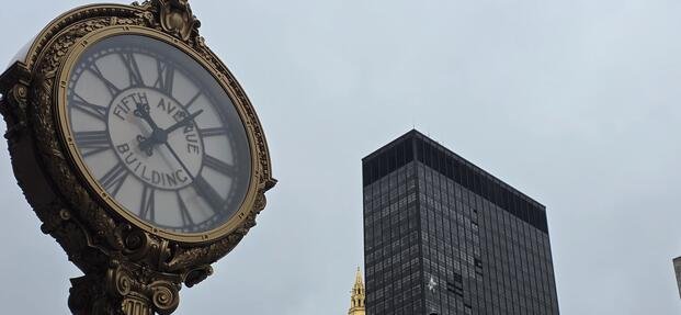 A historic street clock near the Fifth Avenue Building stands in Manhattan as Americans prepare to move their clocks forward for the start of daylight saving time, a tradition that began during World War I. (Darius Radzius)