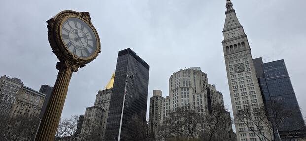 A historic street clock near Madison Square Park and the Metropolitan Life Tower in Manhattan as Americans prepare to move their clocks forward for the start of daylight saving time, a policy first adopted in the United States during World War I. (Darius Radzius)