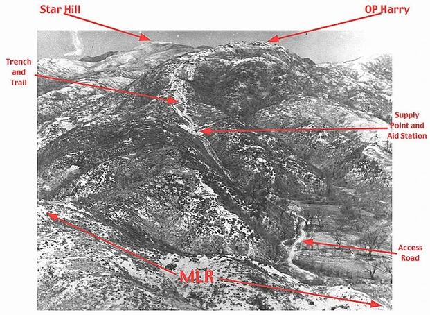 American commanders positioned Outpost Harry on a 1,280-foot hill in Korea's Iron Triangle, a strategic zone that offered a direct invasion route to Seoul. The outpost sat 425 yards in front of the Main Line of Resistance — close enough to spot Chinese movements, but it was far enough out to be dangerously exposed.