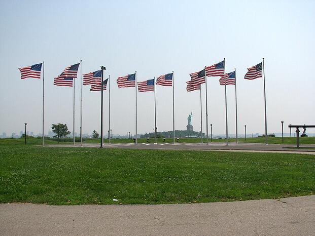 A memorial plaque at Liberty State Park in Jersey City marks the explosion site. A circle of American flags surrounds the plaque, which informs visitors they are "walking on a site which saw one of the worst acts of terrorism in American history."