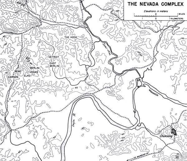 Unlike most situations, the tactical situation favored the attackers. Carson sat 800 yards forward of the MLR, near two Chinese positions. Reno occupied the most exposed ground at 1,600 yards out, perched on terrain that made reinforcement nearly impossible under fire. Vegas, the highest point, stood 1,300 yards from the MLR.