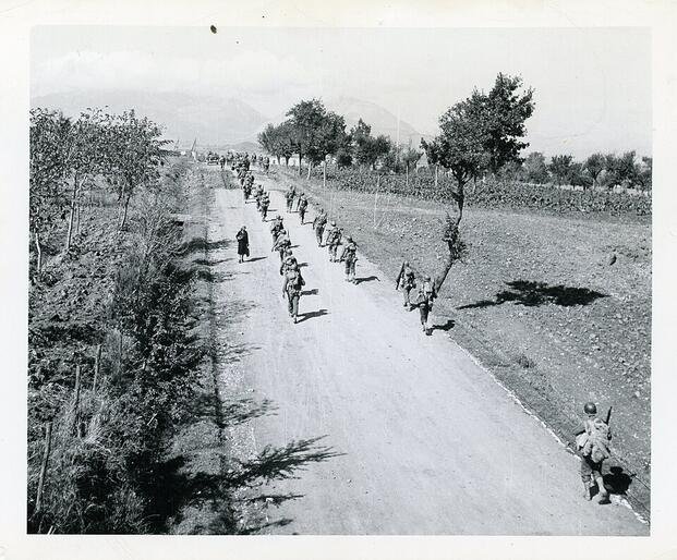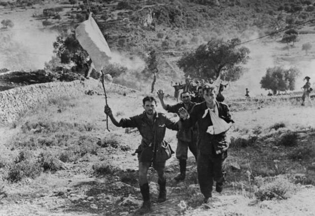 Private Raymond Marlow crept into a nearby draw to find the snipers. He spotted an Italian with a rifle who retreated into a dugout. Moments later, the soldier emerged with 35 others with their hands up. Several wore civilian clothing, possibly because they had been awoken from their sleep and hadn't fully dressed before the battle.