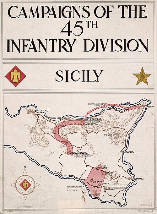 On July 10, 1943, Allied forces invaded Sicily in Operation Husky. Lieutenant General George S. Patton commanded the U.S. Seventh Army while General Bernard Montgomery led the British Eighth Army. Under Patton, Lieutenant General Omar Bradley commanded II Corps, which included the 45th Infantry Division.