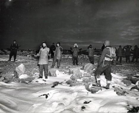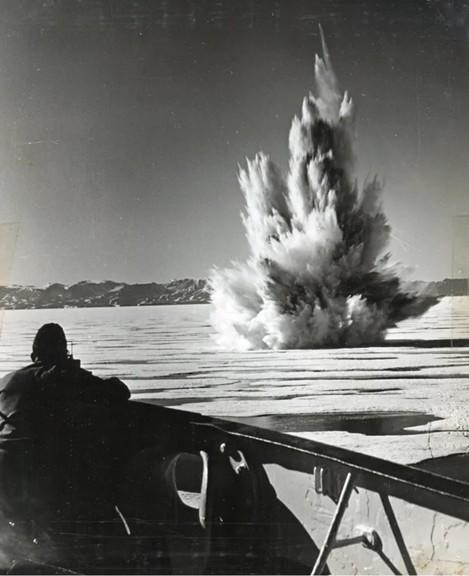 U.S. Coast Guardsmen blast a passage through the ice in the hunt for the Nazi Greenland base (National Archives).