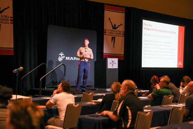 Orlando, FL (Dec. 17, 2024) - U.S. Marine Corps Major Kyle King speaks during the "Fit to Win" seminar to discuss building resilient athletes. Maj King won the MCM in 2022, 2024, and 2025 (U.S. Marine Corps photo by Lance Corporal Brenna Ritchie)