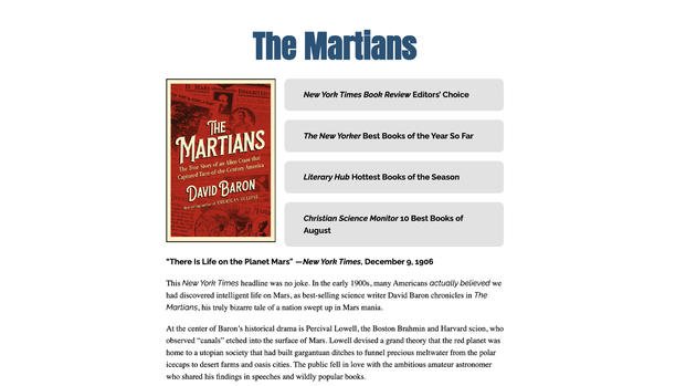 Before Roswell, before radio telescopes, before War of the Worlds sent listeners into a panic, Americans were already convinced that Martians were real and they had canals to prove it. In The Martians, science writer David Baron unpacks the strange but true story of early 20th-century Mars mania, when some of the brightest minds of the era genuinely believed there was intelligent life on the red planet.