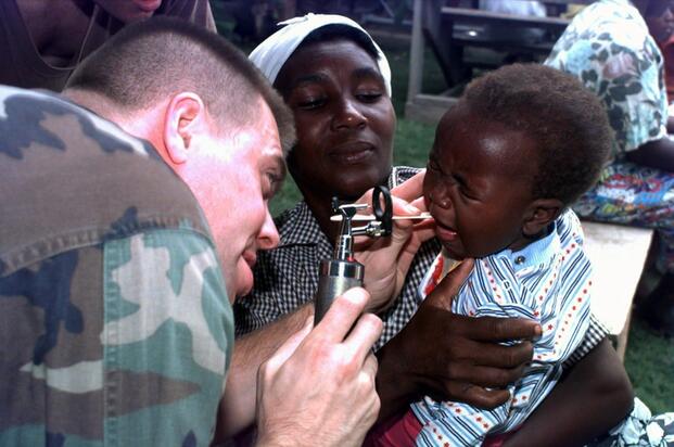 U.S. Army Dr. Victor Worth tries to peer into the mouth of a young Haitian boy during a Exercise Fairwinds humanitarian relief operation in Port-au-Prince, Haiti. DoD photo by Pfc. Tracey L. Hall-Leahy, U.S. Army. Source: DVIDS