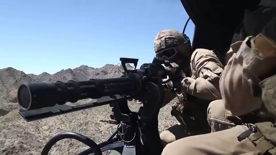 U.S. Marines shoot on an aerial gun range aboard UH-1Y Venom helicopter gunships during Weapons and Tactics Instructor (WTI) course