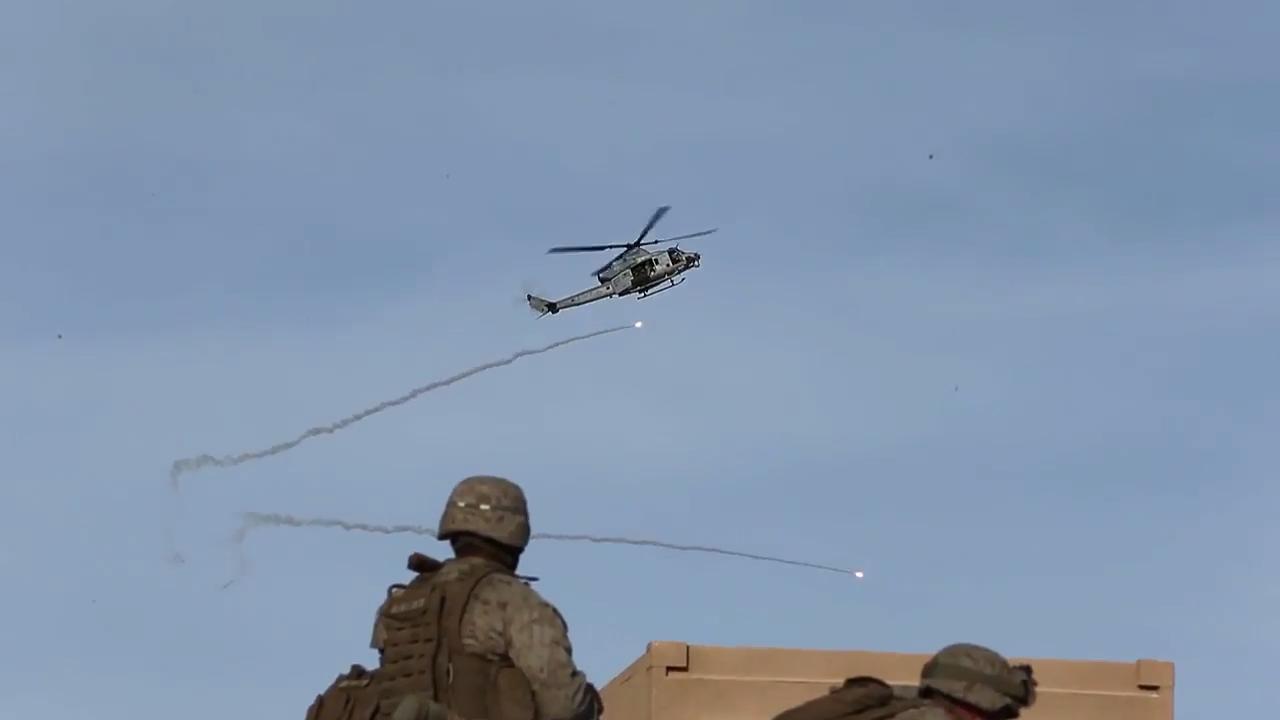 U.S. Marine Corps Super Huey helicopter gunships (a.k.a. UH-1Y Venom) fire rockets and machine guns down on a mock village
