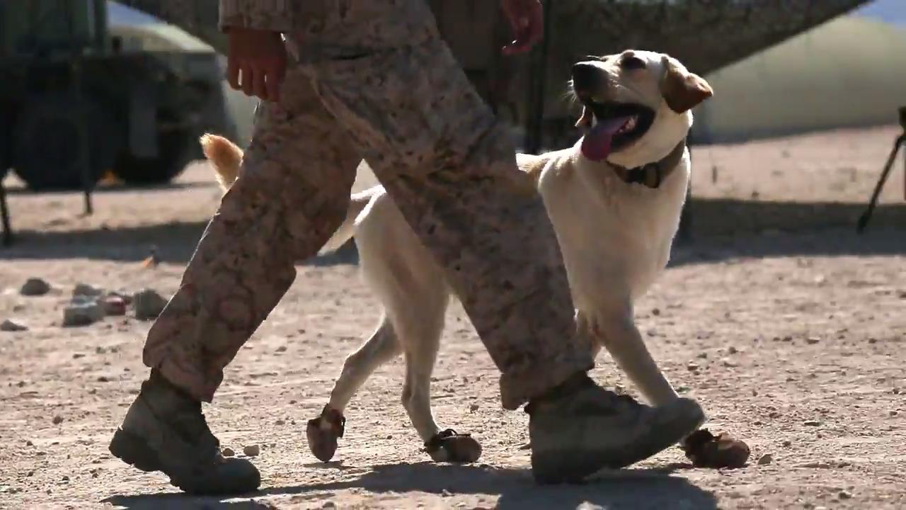 Lance Cpl. U.S. Marine veteran Jeff DeYoung says goodbye to his dog Cena, a 10-year-old black lab who was a
