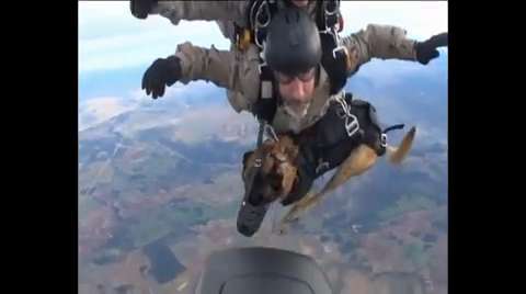A Spanish army parachute brigade performs a tandem jump with K9 units near Madrid.