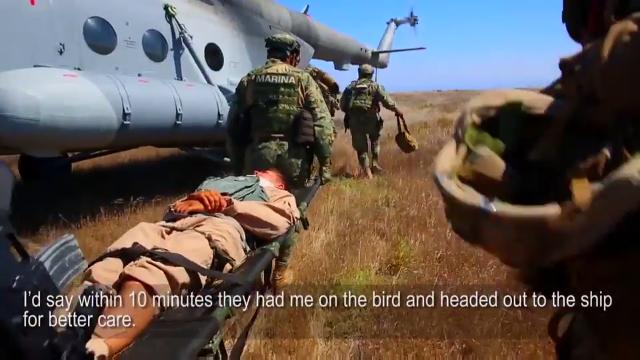 Mexican service members conduct a tactical recovery of aircraft and personnel training mission aboard San Clemente Island during the Southern