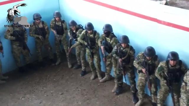 Members of the Iraqi Emergency Response Brigade (E.R.B.) train for close quarters combat at an indoor training facility. E.R.B. is
