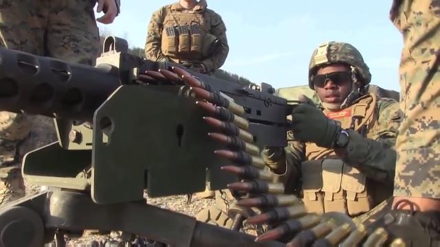 U.S. Marines with 5th Air Naval Gunfire Liaison Company, 3rd Marine Expeditionary Brigade fire the M2 .50 caliber heavy machine