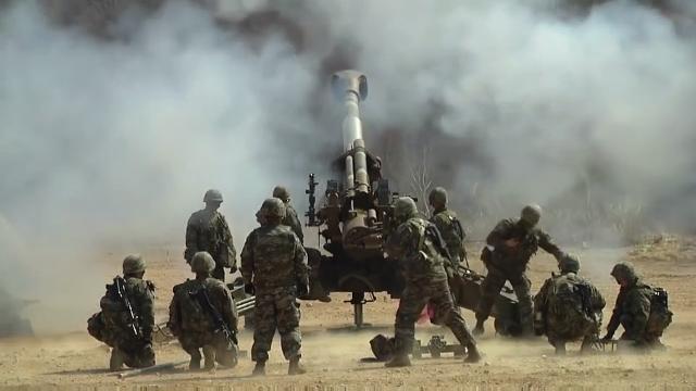 U.S. and Republic of Korea (ROK) Marines send rounds downrange at Sanseori Range, South Korea during an artillery barrage live-fire