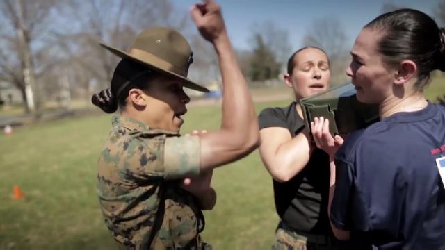 Sgt. Michelle Vazquez, a drill instructor, and Evalena Urena, an enlistee in the Marine Corps' delayed entry program, share their