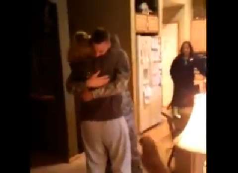 Sergeant Jamee Gaines, back from Afghanistan, surprises husband and kids.