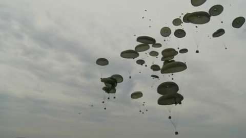 A Russian cargo plane is loaded with humanitarian supplies, and dropped by parachute near the city of Deir Ez-Zor in