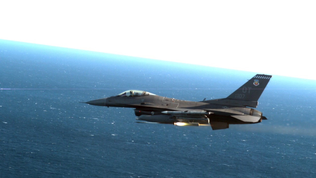 A F-16C flown by Maj Jeffrey Entine, 85th Flight Test Squadron test pilot, fires a rocket at a test drone