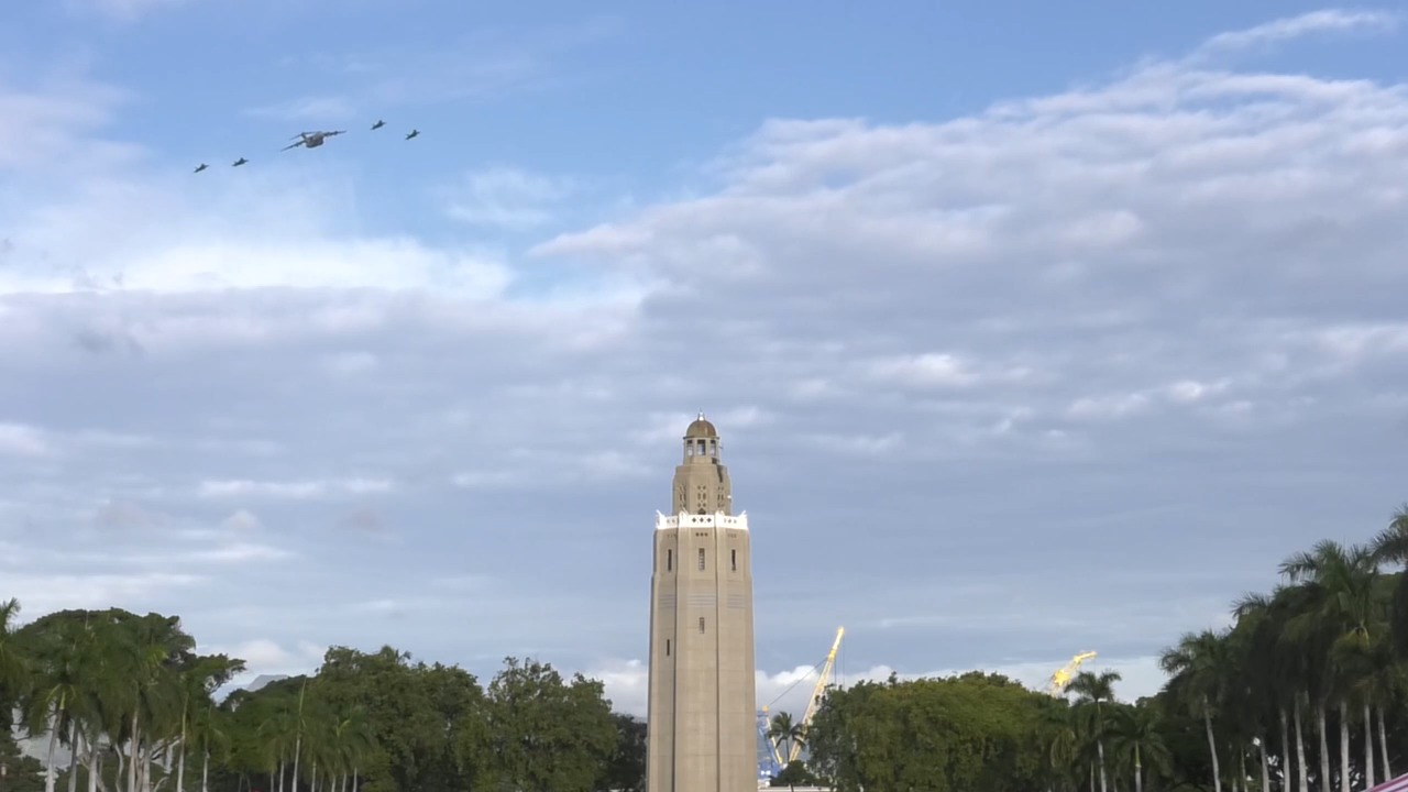 A C-17 and four F-22s fly over Freedom Tower and the 15th Wing HQ building.