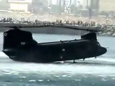 A Chinook helicopter gets a little wet on a touch and go water landing. Beats the car wash any day.
