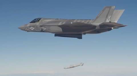 An F-35 Lightning II successfully employs a Guided Bomb Unit-32 (GBU-32) Joint Direct Attack Munition (JDAM) weapon from the internal