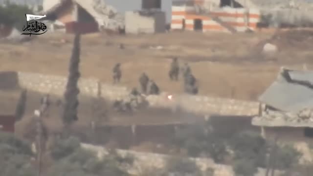 Group of soldiers are devastated by ATGM when they try to cross wall in Aleppo, Syria.