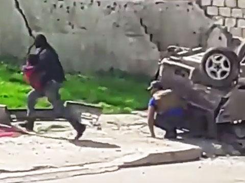 An apparently wounded child is rescued by an Iraqi federal police officer. The place is still under fire by ISIS