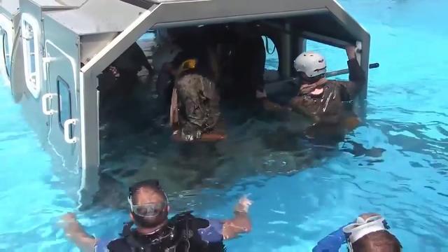 U.S. Marines with Marine Medium Tiltrotor Squadron 262, practice ditching techniques inside of the helo dunker, underwater egress trainer at