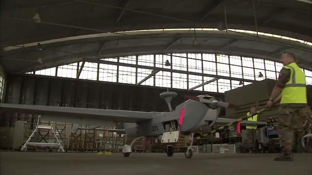 Belgian B-Hunter UAV (unmanned aerial vehicle) filmed at Koksijde Air Base, Belgium on June 28, 2016.