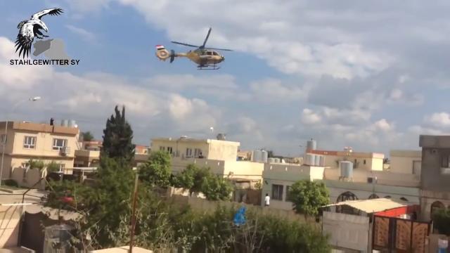 A light attack Eurocopter EC635 helicopter belonging to the Iraqi Army Aviation is filmed from the ground in northeastern Iraq.