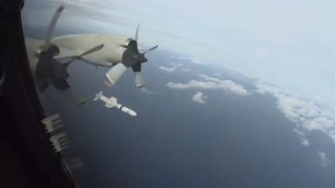 A Japan Maritime Self-Defense Force P-3C fires a Harpoon during a SINKEX as part of Rim of the Pacific (RIMPAC)