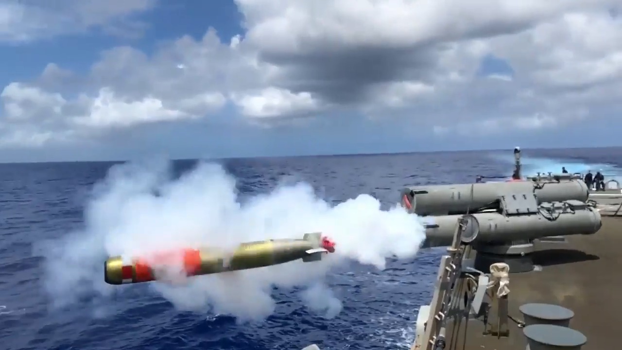 A recoverable exercise torpedo is launched from the Ticonderoga-class guided-missile cruiser USS Chancellorsville.