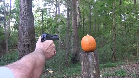 Firearm: Desert Eagle Mark 7 -- Ammo: MagTec 240 grain factory loads. Check out more "pumpkin carving with a gun"