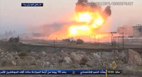 Syrian state television footage shows the moment two car bombs exploded near the broadcaster's headquarters in Damascus on Sunday. Hussam