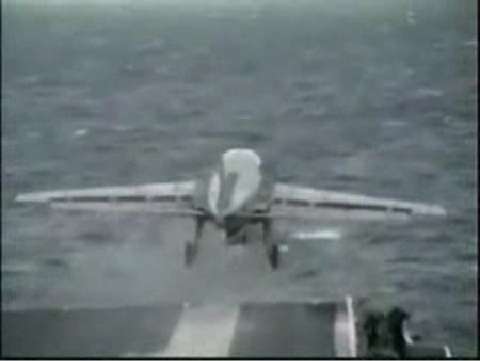This plane launches off the carrier, something seems the drop from it, and it plunges into the water as the