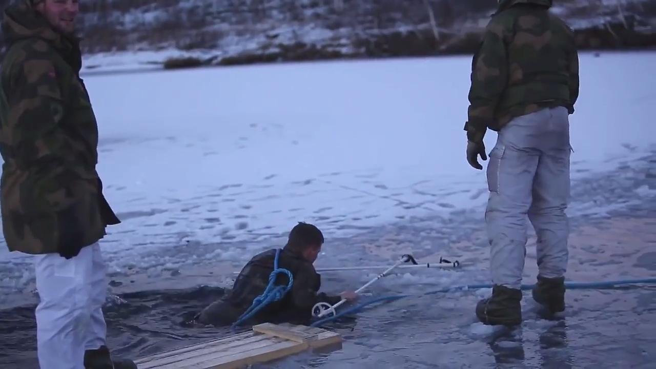 U.S. Marines jump into icy water as part of extreme cold weather training conducted by Soldiers of the Norwegian Army