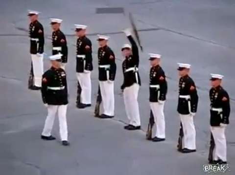 A Marine throws his rifle during a Silent Drill Team demonstration and the receiving Marine drops it. You know he