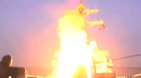 Tomahawk cruise missiles being launched towards Qadhafi regime forces as a part of JTF Odyssey Dawn. USS Stout (DDG-55) is
