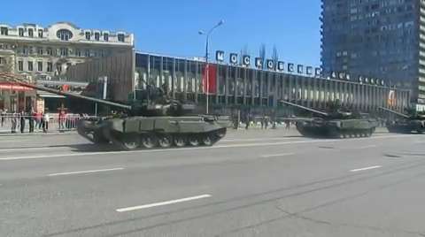 Russian Tanks roll down a street during a rehearsal for the Victory Day Parade.
