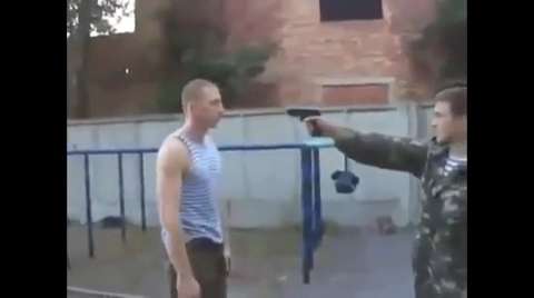 A Russian soldier demonstrates how to quickly disarm an attacker. Hope that wasn't live ammo.