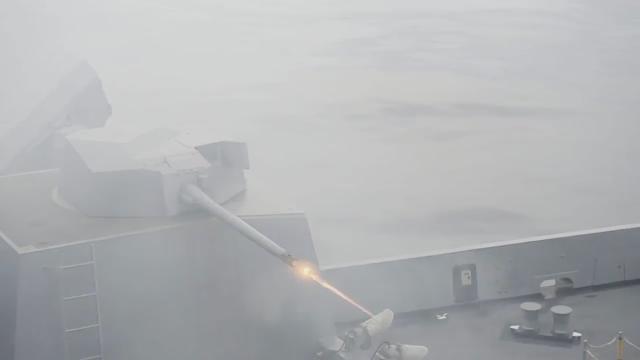 The amphibious transport dock ship USS Green Bay (LPD-20) fires MK-46 30mm gun during a live-fire exercise on August 17