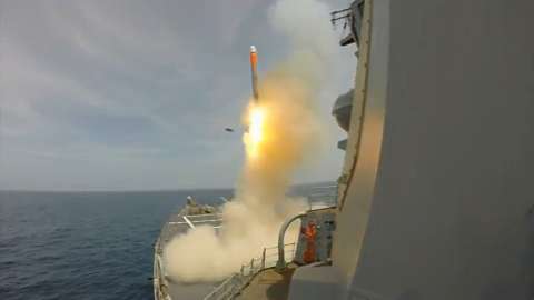 Multiple camera angles catch a Tomahawk Cruise Missile fired from the USS Gridley.