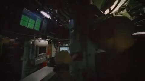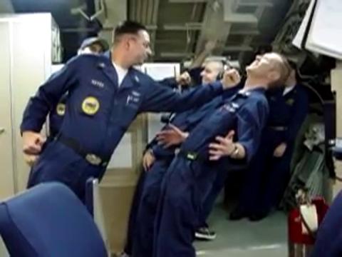 US Navy sailors on a Trident submarine maintain their balance while the ship does a 29 degree up angle.