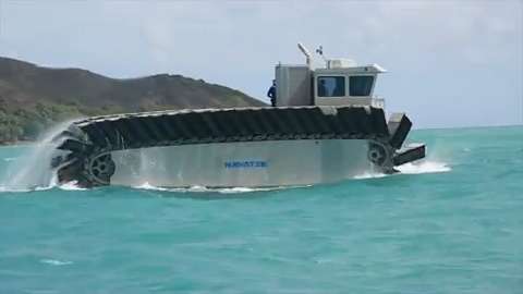 An Office of Naval Research and Marine Corps Warfighting Lab half-scale Ultra Heavy-lift Amphibious Connector (UHAC) prototype demonstrates its unique