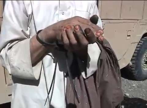 B-roll of Afghan National Army and U.S. Army forces discover a home made rocket launcher and detain four local national