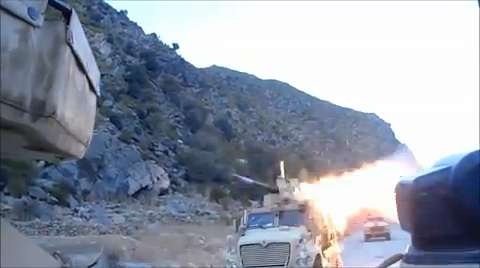 A TOW missile is used by "No Slack" battalion to eliminate a Taliban ambush position further up the road. Thermal